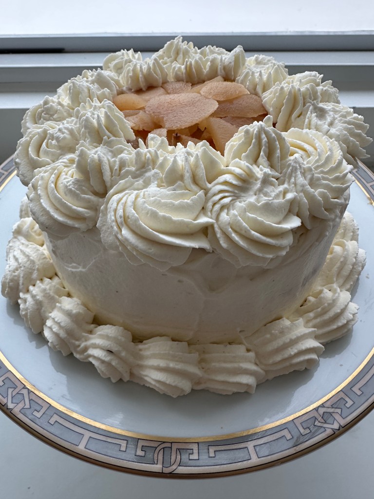 Once cooled, cut the cake in 3 equal portions lengthwise and cover with Chantilly cream and add a fruit of your choice.